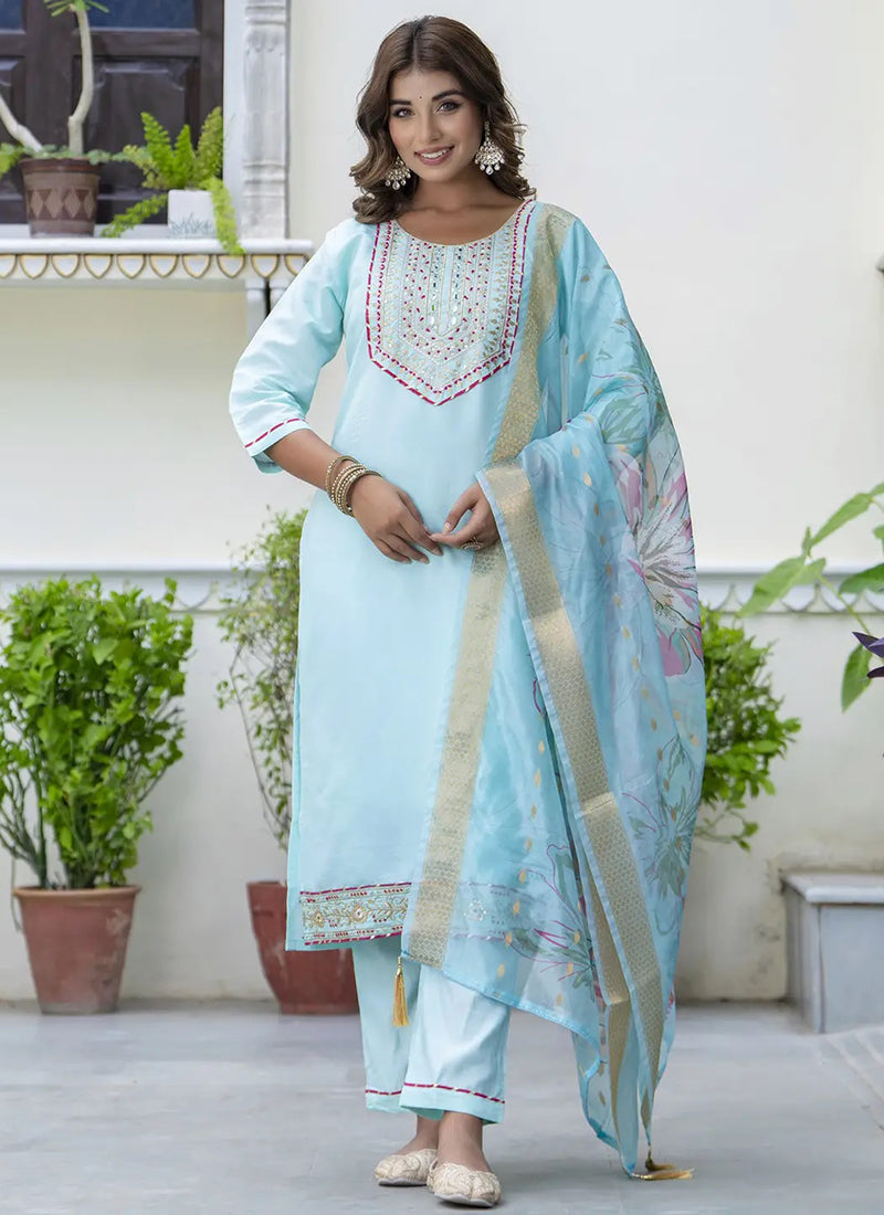 Aqua Blue Cotton Embroidered Festive Wear Kurta Set