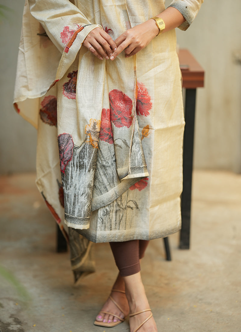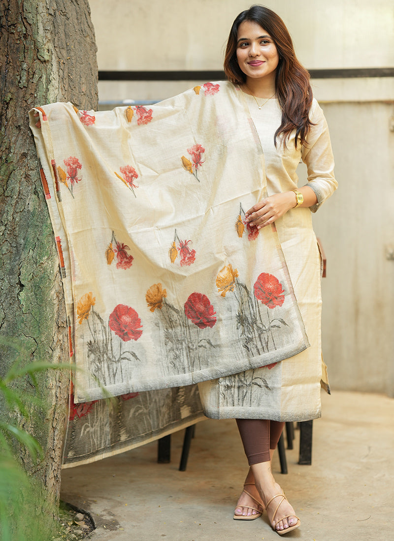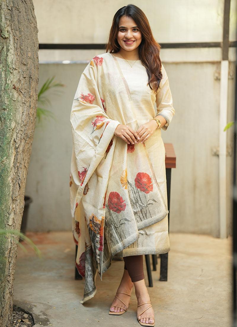 Elevate your ethnic wardrobe with this stunning Cream Floral Printed Cotton Kurta and Dupatta! 👗 Crafted from pure cotton jacquard fabric, this versatile ensemble is perfect for any occasion—whether it's a festive celebration, casual gathering, or special event. The elegant round neckline and comfortable 3/4 sleeves offer a flattering fit, while the generous 40"+ length ensures graceful draping. The matching 2.5-meter dupatta adds a touch of sophistication and styling flexibility. ✨ With its timeless floral print and breathable cotton construction, you'll stay cool and comfortable all day long. Ideal for traditional wear enthusiasts seeking quality and style combined! 🌸