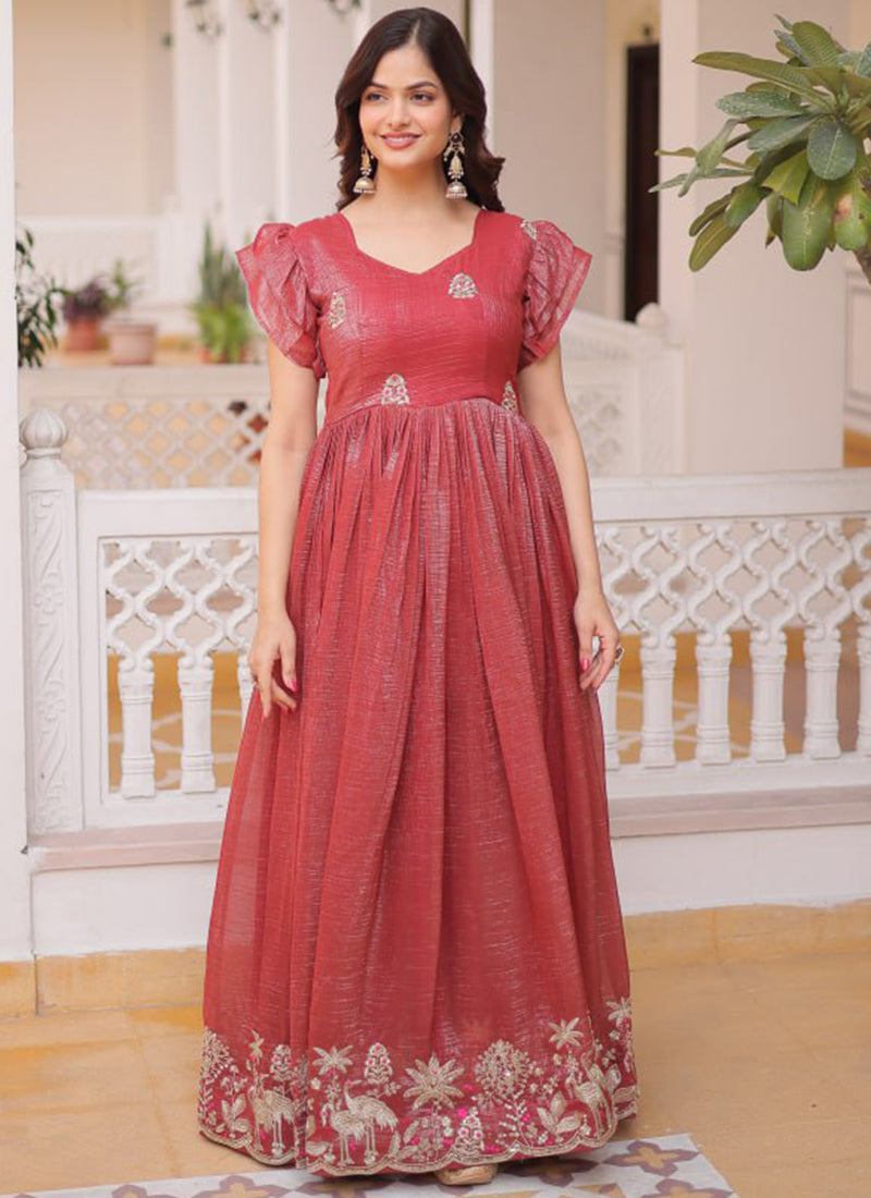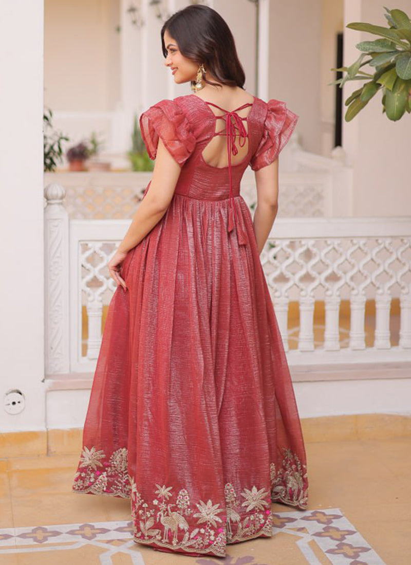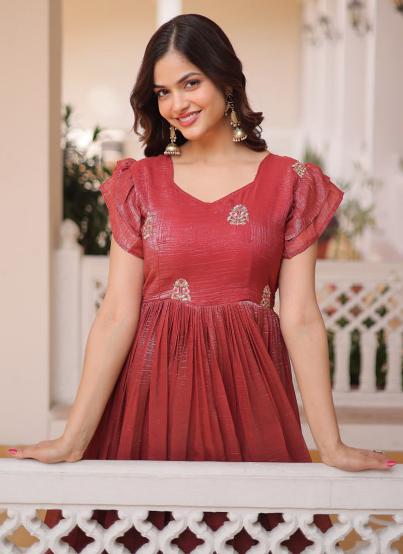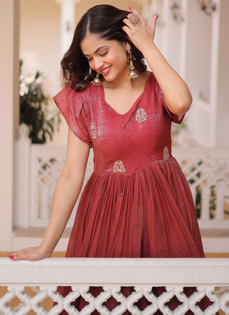 Deep Maroon Silver Crunchy Floor Length Anarkali Style Gown