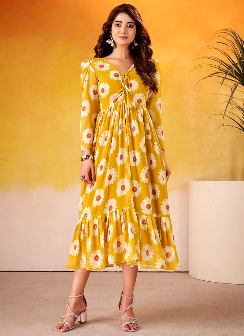 Floral Print Mustard Long Sleeve Tiered Midi Dress