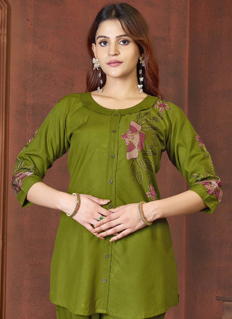 Discover timeless elegance with this Green Rayon Embroidered Cord Set, expertly designed for your most cherished occasions. 🌿 Crafted from premium rayon fabric, this ensemble showcases intricate embroidered embellishments that reflect refined artisanal skill and attention to detail. The rich emerald tone offers versatility across various complexions and styling preferences. Ideal for weddings, festivals, and formal events, this sophisticated set seamlessly blends traditional aesthetics with modern sensibilities. 👗 The breathable rayon composition ensures comfort throughout extended wear, while the ornate cord detailing elevates your presence with understated luxury. A wardrobe essential for those who appreciate quality craftsmanship and timeless style. ✨