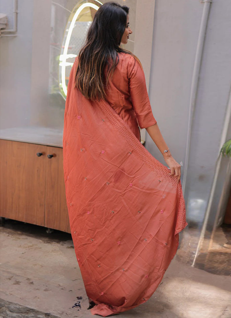 Peach Embroidered Chanderi Cotton Festive Kurta Set