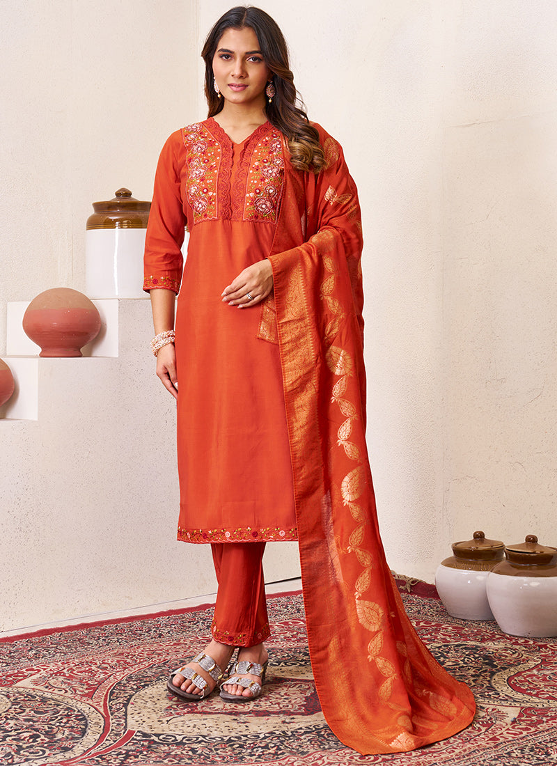 Discover refined celebration wear with this Rust Roman Silk Embroidered Festive Kurta Set 🎊. Constructed from sumptuous Roman silk, this sophisticated ensemble features precision machine embroidery that elevates your festive presence. The deep rust tone offers universal flattery while the detailed embroidered work demonstrates superior artisanal quality. Ideal for weddings, festivals, and milestone celebrations, this kurta set merges traditional aesthetics with modern comfort standards. The natural breathability of silk ensures all-day wearability without compromising on elegance. Perfect for those who appreciate authentic craftsmanship and desire a statement piece that transcends seasonal trends ✨👑.