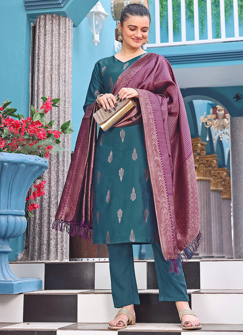 Teal Blue Woven Jacquard Festive Kurta Set