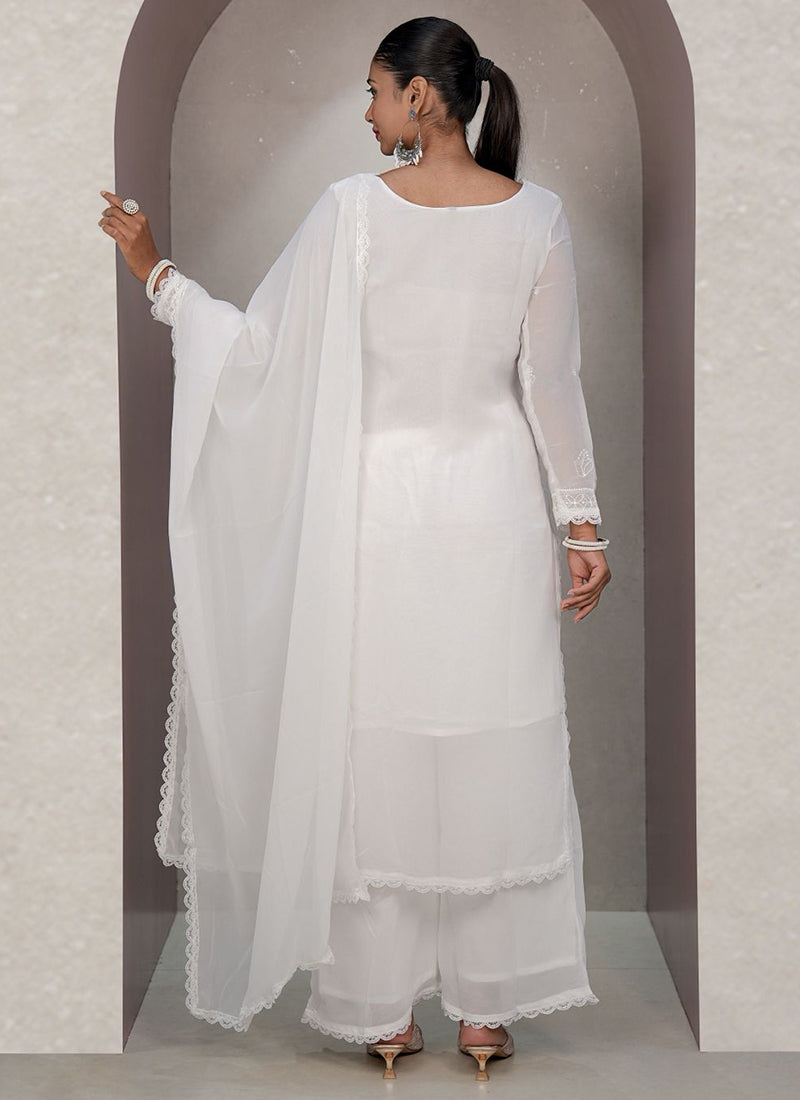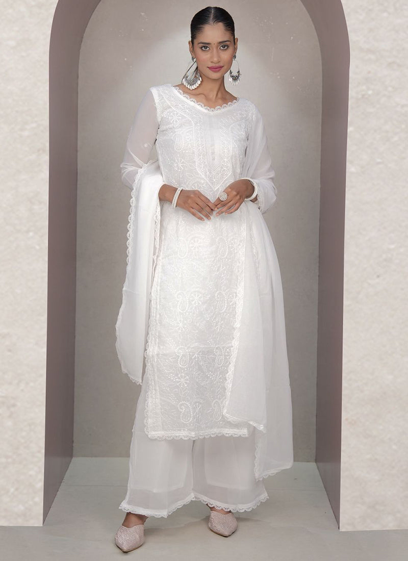 Elevate your ethnic wardrobe with this exquisite White Chikankari Georgette Palazzo Style Kurta Set. 👗 Crafted from premium georgette fabric, this ensemble features intricate hand-embroidered chikankari detailing that showcases traditional artistry. The flowing palazzo silhouette offers unparalleled comfort and grace, perfect for festive occasions, celebrations, or everyday elegance. The delicate embroidery work adds sophistication while maintaining breathability, making it ideal for warm climates. ✨ This timeless piece combines heritage craftsmanship with contemporary styling, ensuring you stand out with refined taste and cultural appreciation. 🌸