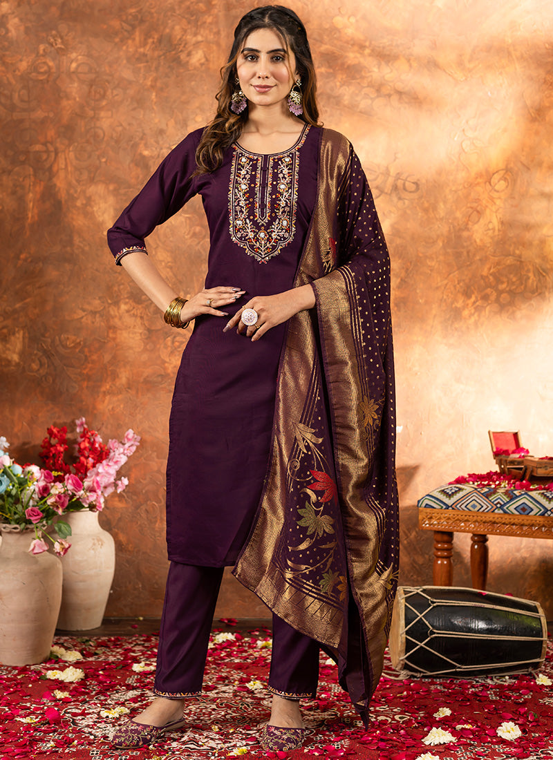 Elevate your ceremonial wardrobe with this exquisite Wine Marian Silk Thread Work Kurta Set. 👗 Crafted from premium silk fabric, this ensemble features intricate thread embroidery that showcases traditional artistry and refined craftsmanship. The rich wine hue exudes elegance and sophistication, making it an ideal choice for weddings, festivals, and special celebrations. ✨ The coordinated set ensures a polished, cohesive look that commands attention. Perfect for those who appreciate timeless ethnic wear with contemporary appeal, this kurta set combines comfort with stunning visual impact. 🎉 Ideal for birthdays, engagements, and festive occasions where you want to make a memorable impression.